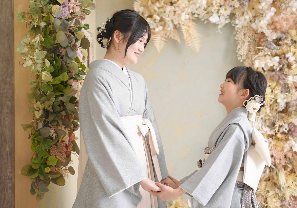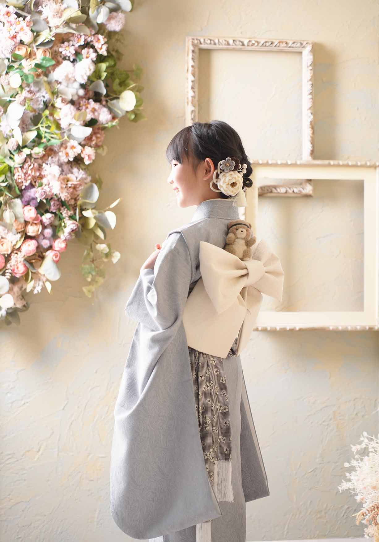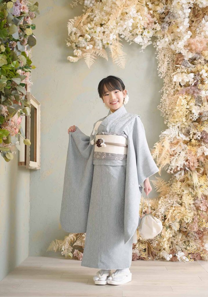 くすみブル-のお着物と今どきの背景がとてもマッチしてますね!!